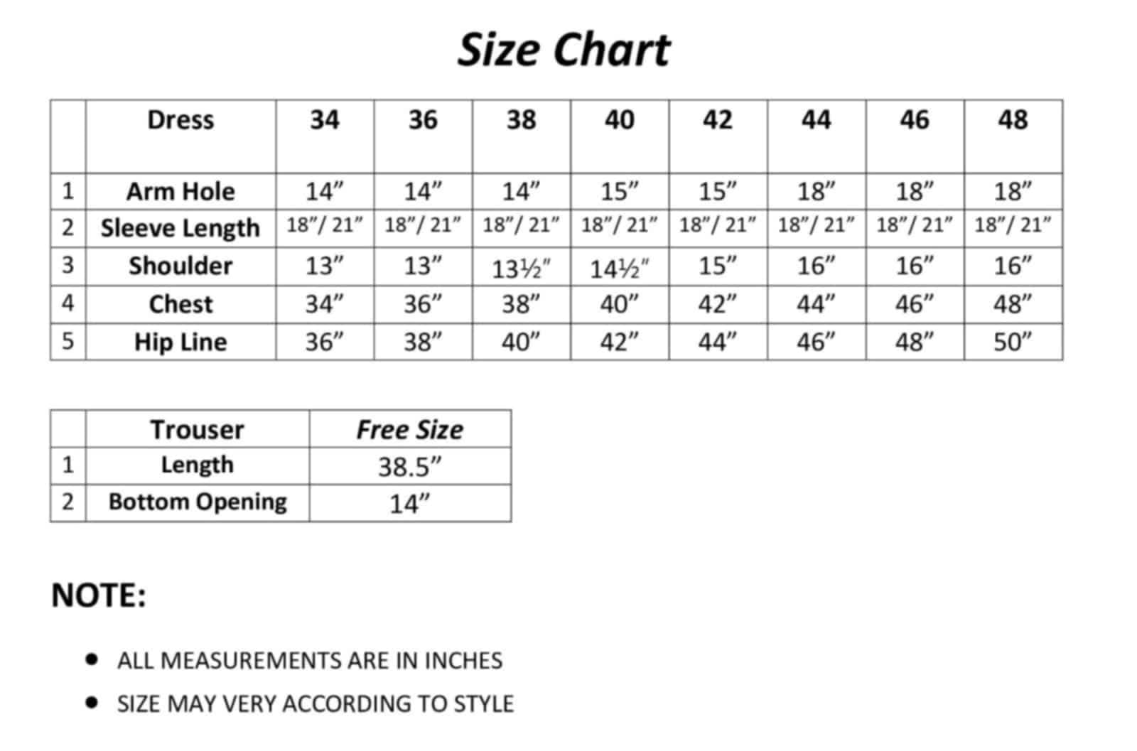 Body: 38, 40, 42, 44, 46, 48